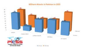 Militant violence in February 2025 saw a marginal increase in attacks but a sharp surge in civilian casualties, according to a report by the Islamabad-based think tank Pakistan Institute for Conflict and Security Studies (PICSS). The country witnessed 79 militant attacks, resulting in the deaths of 55 civilians and 47 security personnel, while 81 security […]