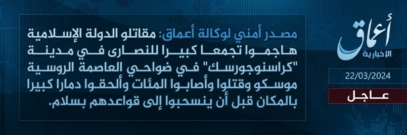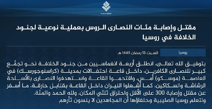 A security source to Amaq Agency: Islamic State fighters attacked a large gathering of Christians in the city of Krasnogorsk on the outskirts of the Russian capital, Moscow, killing and wounding hundreds and causing great destruction to the place before they withdrew to their positions safely.”