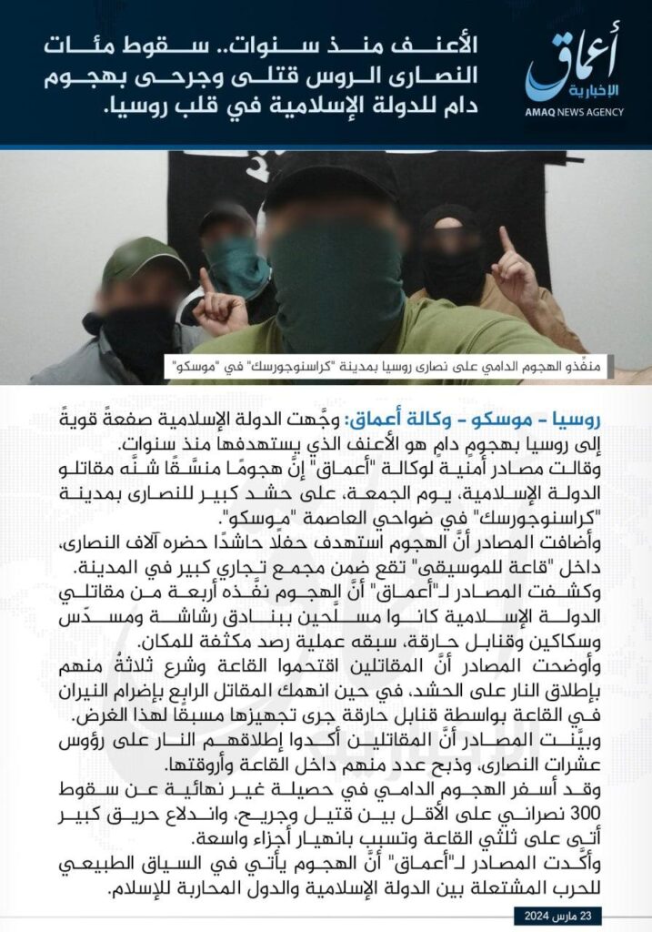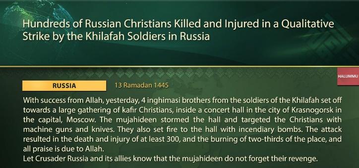 I have carefully analysed content of Islamic State published by different chapters of the group about an attack in Russian capital Moscow on a concert  hall March 23, 2024 in which more than 100 people were killed any hundreds others injured.